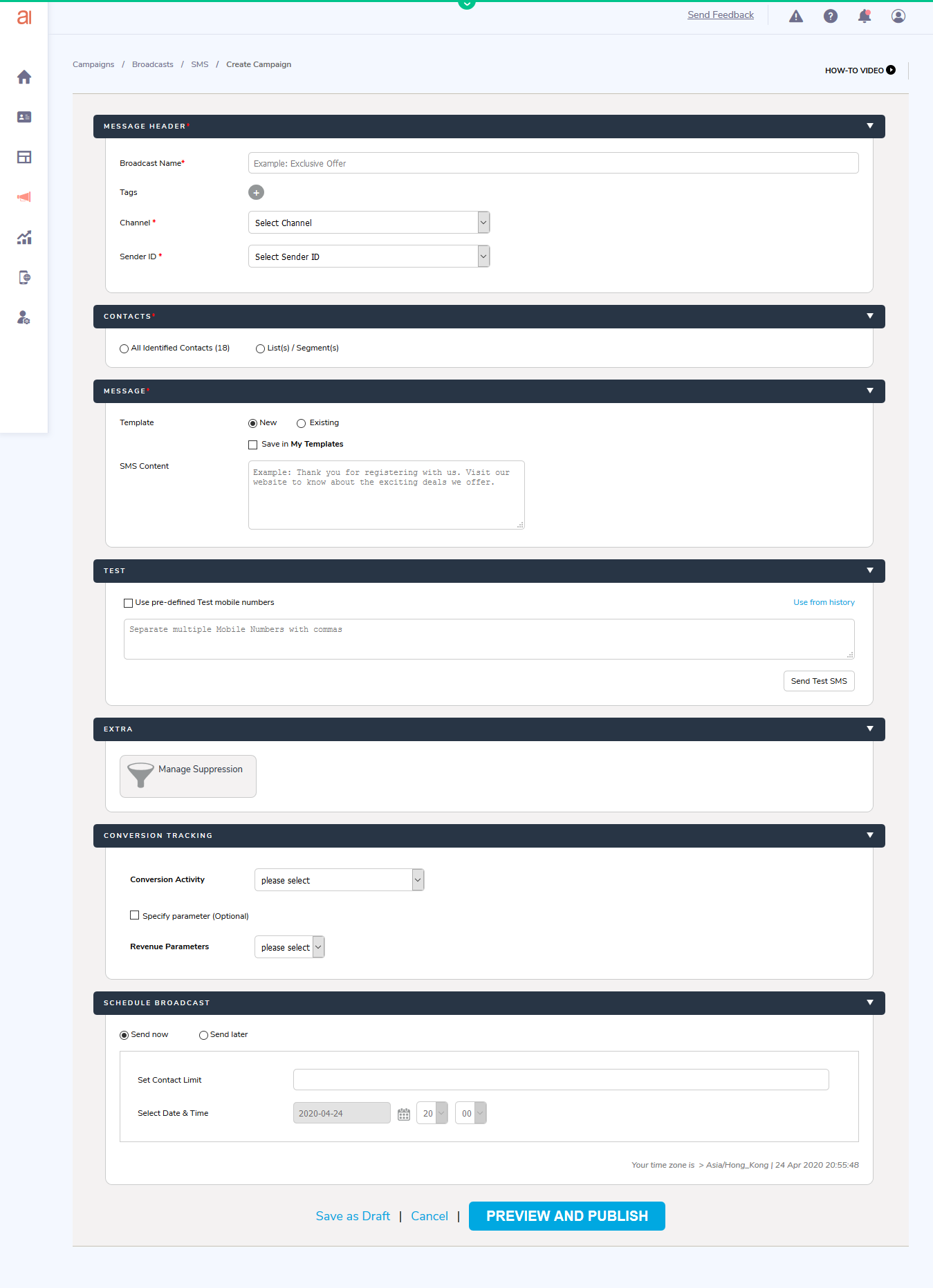 - Advanced Details allow you to set a limit to the number of contacts to whom you wish to send the broadcast. For instance: If the List comprises 100 contacts, and you set the contact limit to 80, the broadcast will be sent to any 80 contacts of the list.