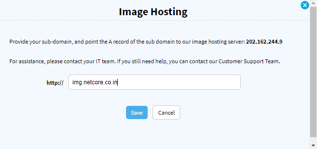 4) Enter the image hosting sub-domain in the text box. Please note the A record for the sub-domain should point to 202.162.244.9, i.e. the A record for img.yourdomainname should point to 202.162.244.9