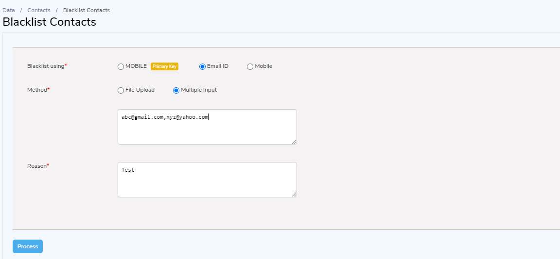 a) File Upload for Bulk Blacklist(Only CSV files with a maximum size up to 150 MB allowed)
