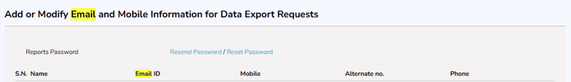 - Under the section "Add or Modify Email and Mobile Number Data for the Reports," make the necessary changes and save.